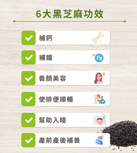 黑芝麻富含高鈣、鐵、膳食纖維、不飽和脂肪酸及芝麻素。具備強效抗氧化、降低膽固醇、改善便祕、護心血管及補鈣防骨鬆蓋。