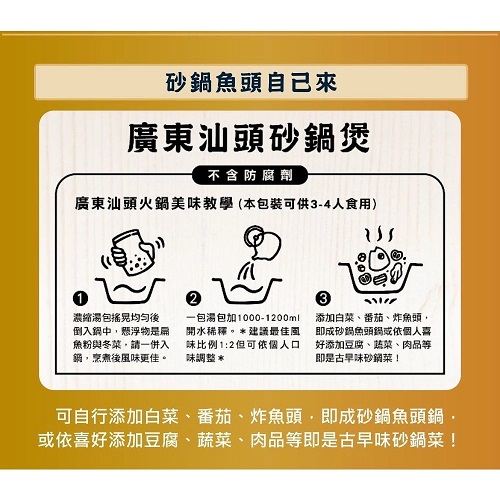 湯底遵循廣東傳統古法製作,沙茶爆香引味,扁魚作料頭,豬骨作底韻,煲出醇厚精髓,再提醋吊鮮,湯鮮味美。可自行添加白菜、番茄、炸魚頭,即成砂鍋魚頭鍋。微酸開胃,是完美的砂鍋火鍋湯底。